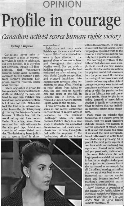 Afshin-Jam not only made Fatehi’s specific case a worldwide “cause célèbre” but expanded her work to draw attention to the general abuse of women in Iran, and throughout the radical Muslim world. As president of The Institute for Public Affairs of Montreal I was privileged to have her speak at our recent Conference on “Questions of Values: Ways of Response to the Islamist Challenge” where she used Nazanin Fatehi's story as a case study to illustrate the embedded discrimination that exists under Sharia Law. On radio, I was immensely gratified with the response to the fund-raising efforts we helped with in her campaign. In this age of universal deceipt, when as George Orwell wrote “…merely speaking the truth is a revolutionary act…”, Afshin-Jam’s campaign of speaking truth to the power of a murderous regime has truly been a profile in courage.